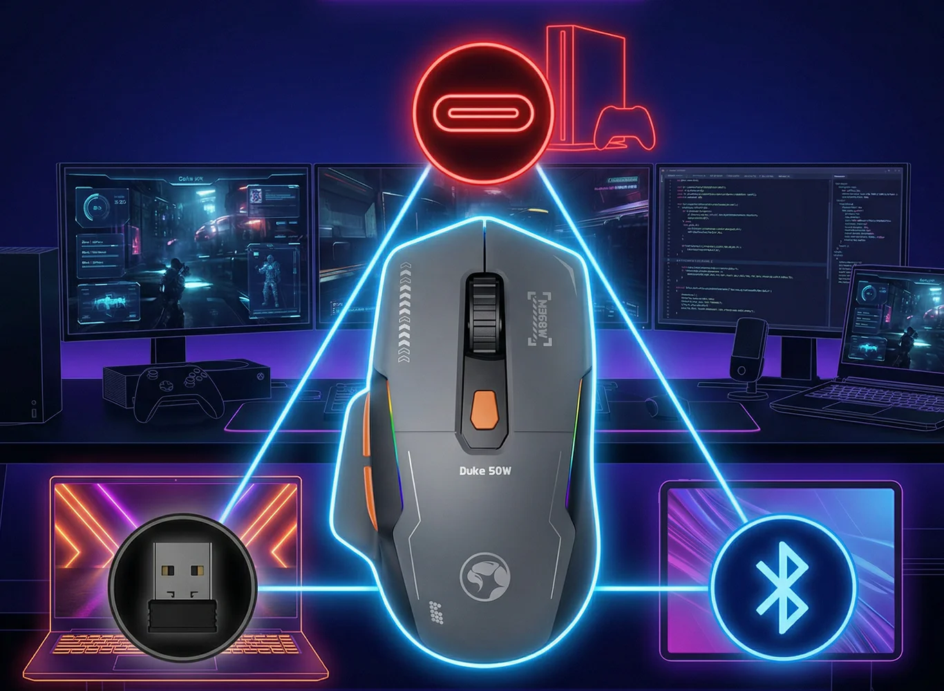 El ratón inalámbrico tri-mode DUKE 50W está pensado para jugadores que necesitan flexibilidad, precisión y un rendimiento fiable en varios dispositivos. Con conectividad trimodo, un diseño ligero y opciones de personalización avanzadas, ofrece una experiencia perfecta tanto para jugar como para el uso diario.