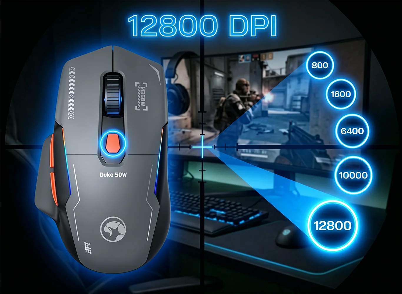 6 niveles de DPI (800-12800) para un seguimiento preciso y una sensibilidad personalizable. - Rendimiento ultrarrápido