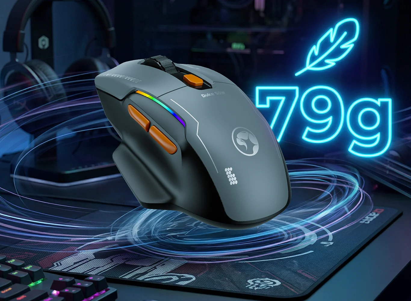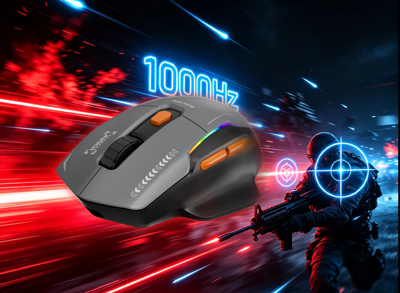 Con una frecuencia de sondeo de 1000 Hz (2,4G y por cable), el DUKE 50W garantiza tiempos de respuesta rápidos y un movimiento fluido del cursor, lo que te proporciona una ventaja competitiva en los juegos de ritmo rápido.